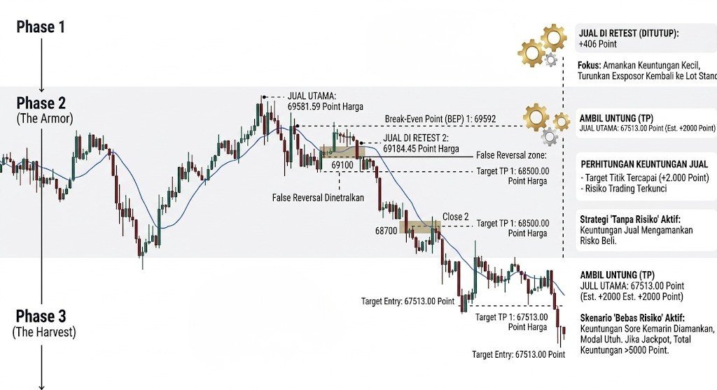 - Risk-Free Move: Begitu harga meluncur ke 69.000, saya segera menggeser Stop Loss (SL) ke titik masuk (Break Even Point atau BEP). Sejak saat itu, saya berada dalam mode Risk-Free Trading—apa pun yang terjadi, modal saya sudah aman.